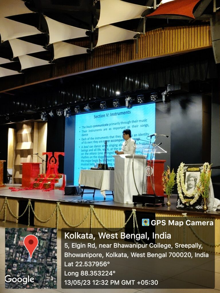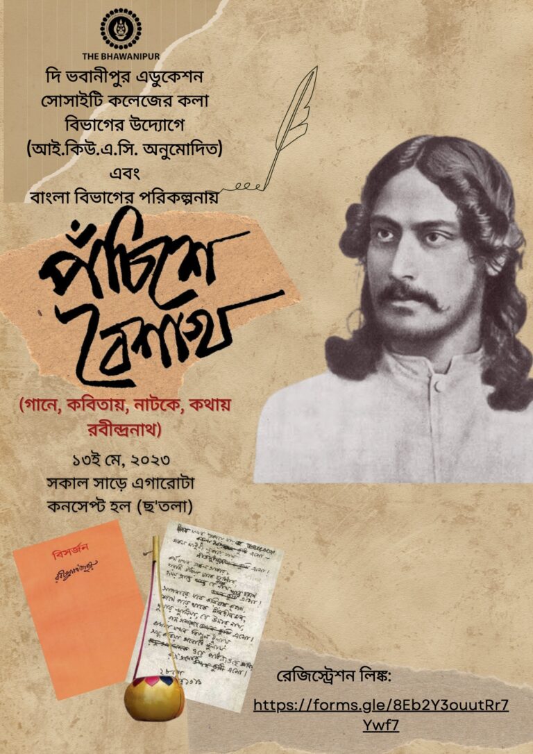 The Bhawanipur Education Society College celebrated the 162nd birth anniversary of Rabindranath Tagore on 13th May 2023 (Saturday). It was organized by the Department of Bengali in collaboration with the IQAC. The event commenced with the lighting of the lamp followed by the inaugural song presented by Prof. Pushpita Ganguly, Associate Professor, Department of Statistics. The key note address was given the Teacher-in-Charge Dr.Subhabrata Gangopadhyay. The next speaker was Prof. Debjani Ganguly, Vice Principal of Arts who spoke on the contemporary relevance of Tagore. The resource person of the programme was Prof. Indrashish Banerjee, Associate Professor of Ramkrishna Mission Vidya Mandir Political Science Department. He presented a paper entitled “Bhanga Gaan Gora Gaan, Prachya Pashchatya o Kobi Guru”. Apart from discussing the history and the timeline of Tagore’s folk music creations, he also focused on the different and popular genre of the Baul community.