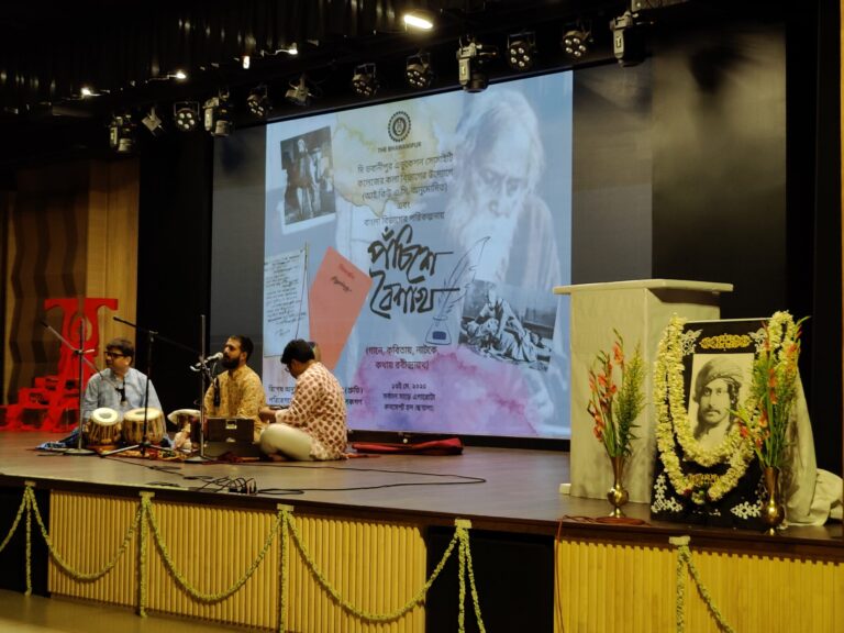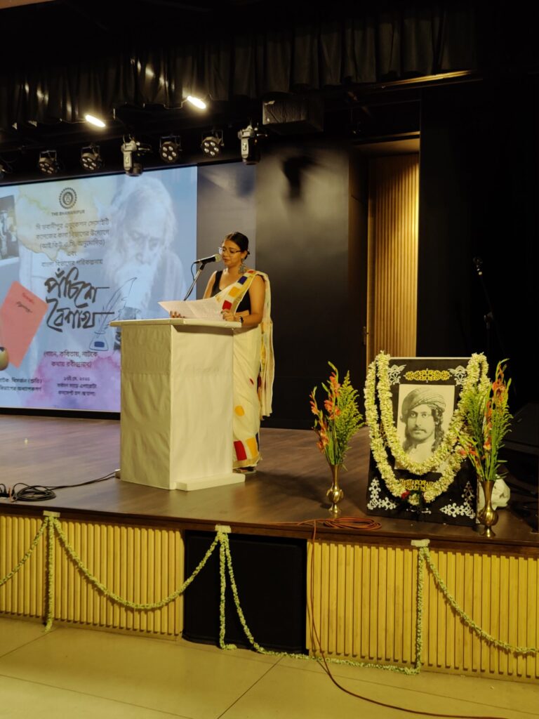 Audio Drama(Teachers’ Contribution) “Bisarjan” was staged by the teachers of various departments. The entire audio drama was seen in rapt attention and immensely appreciated by the audience as this piece put forward the absolute crisis that is created due to religious superstition and dogmatism which leads to sacrifice in the name of religion, and how Rabindranath counters it with his logic of humane understanding of these inhuman practices.
