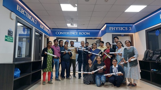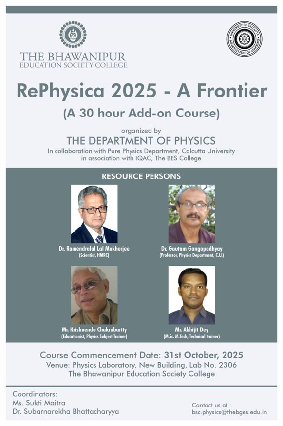 Brief description of the event: This event was held in collaboration with the Pure Physics department, C.U. and in association with the IQAC, The B. E. S College. In the 1st session Educationist Mr. Krishnendu Chakrabartty conducted a workshop where students made different models in Physics. During this workshop students explored the fascinating world of physics together. In the 2nd session, professor of Physics Department,Calcutta University, Dr. Goutam Gangopadhyay delivered an enriching lecture on ‘Nuclear Medicine’. The 3rd session was conducted by Technical Trainer, B. E. S College Mr. Abhijit Dey. In this season students learned how to make power supply which is very much helpful for their future study. The last season was conducted by Scientist, HMRC Dr. Ramendralal Mukherjee. He guided our students to make telescopes. Teachers from the Physics and Computer Science Department joined in this workshop.