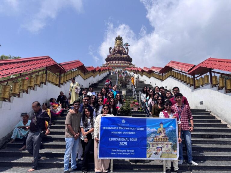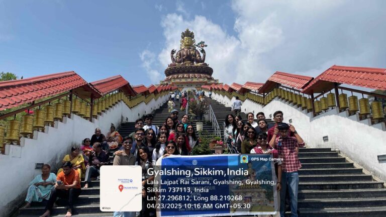 Brief description of the activity: The tour started from Howrah station in the afternoon of 21st April 2025. After a night halt at Siliguri, the group of 23 students and 4 teachers reached Pelling on 22nd April 2025 afternoon. After lunch, the students straightway went to the lower Pelling marketplace to conduct the aforementioned survey based on the questionnaire prepared under the guidance of the teachers. They took first-hand interviews to collect data on the preference patterns of tourists in Pelling and its interactions with the local tourism industry by surveys on both ends of the contact, i.e. the consumers and the local homestay based firms that make up the tourism industry in Sikkim. After such plentiful local interactions, the students returned to the hotel exhausted by the long day of travel and survey. In the next two days, the students were provided with the opportunity to further their knowledge on local tourism via the following sight-seeings (the majestic Namchi Chardham, the serene Ravangla Buddha Park, the pious Khecheopery Lake, Kanchenjunga Waterfall, Orange garden, Temmi Tea Garden, the new Pelling Skywalk, to name only a few). In addition to such academic motivations, the tour provided the students with roller-coaster experiences of long drives in the mountains, Mt. Kanchenjungha view during sunrise, chilly bonfires, and last but not the least, the amazing food and hospitality of the hills. The students, with their teachers, returned to Howrah station on Saturday, less tired and more overwhelmed by the week spent together, gone by as if in a blink.