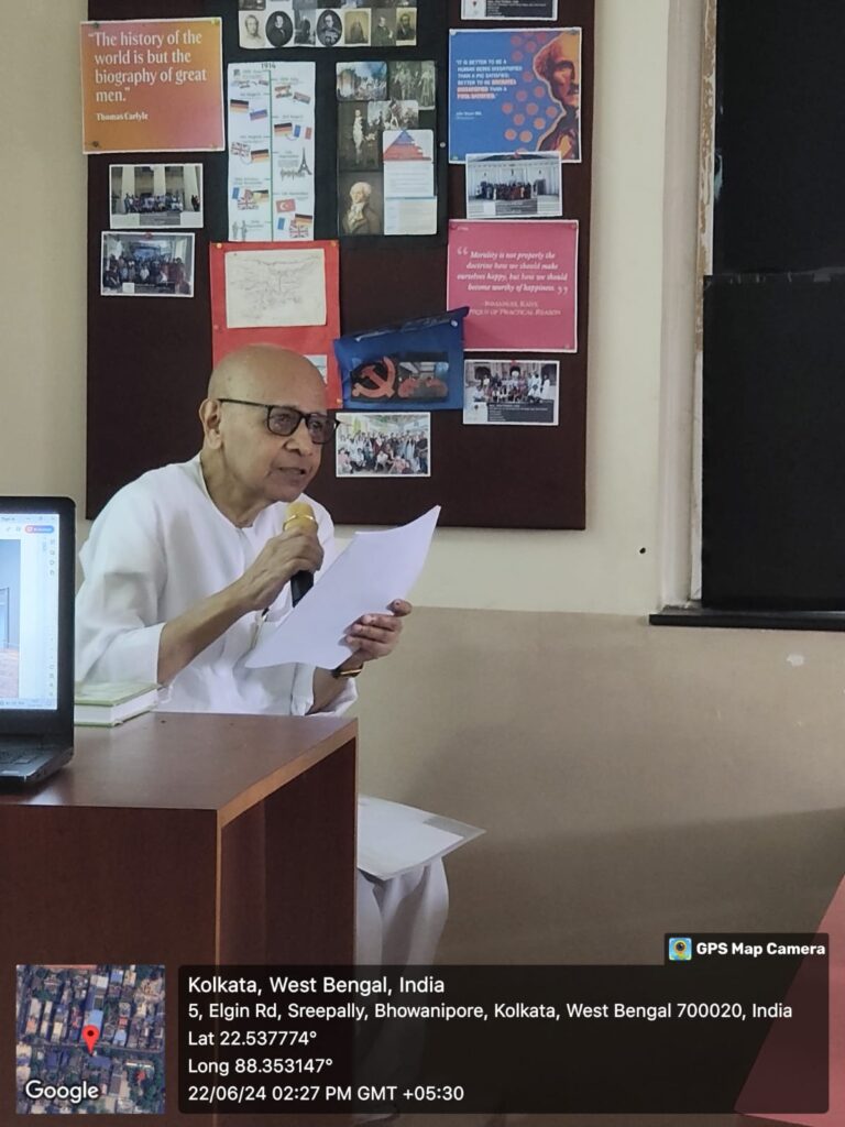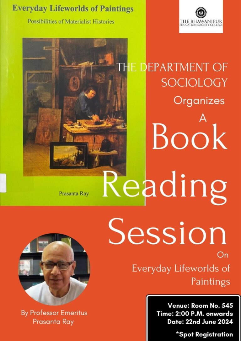 A Book Session was organised by the Department of Sociology ,The Bhawanipur Education Society College on June 22nd, 2024. Prasanta Roy, Professor Emeritus, Presidency University, Kolkata was invited to speak and read from his authored book “Everyday Lifeoworlds of Painting : Possibilities of Materialist History”. Prof. Roy undertook an interactive session with students and faculty members discussing the manifest histories of paints and paintings, with special reference to paint makers, artists, functions of ijel and canvas, and advertisement techniques of art. Professor Roy also emphasized upon the mechanical reproduction of art work as a demand of capitalist market. The scholarly session had enriched us and the students about the evolution of paints, painting styles and the industrial revolution and colonialism in the evolution of art work.