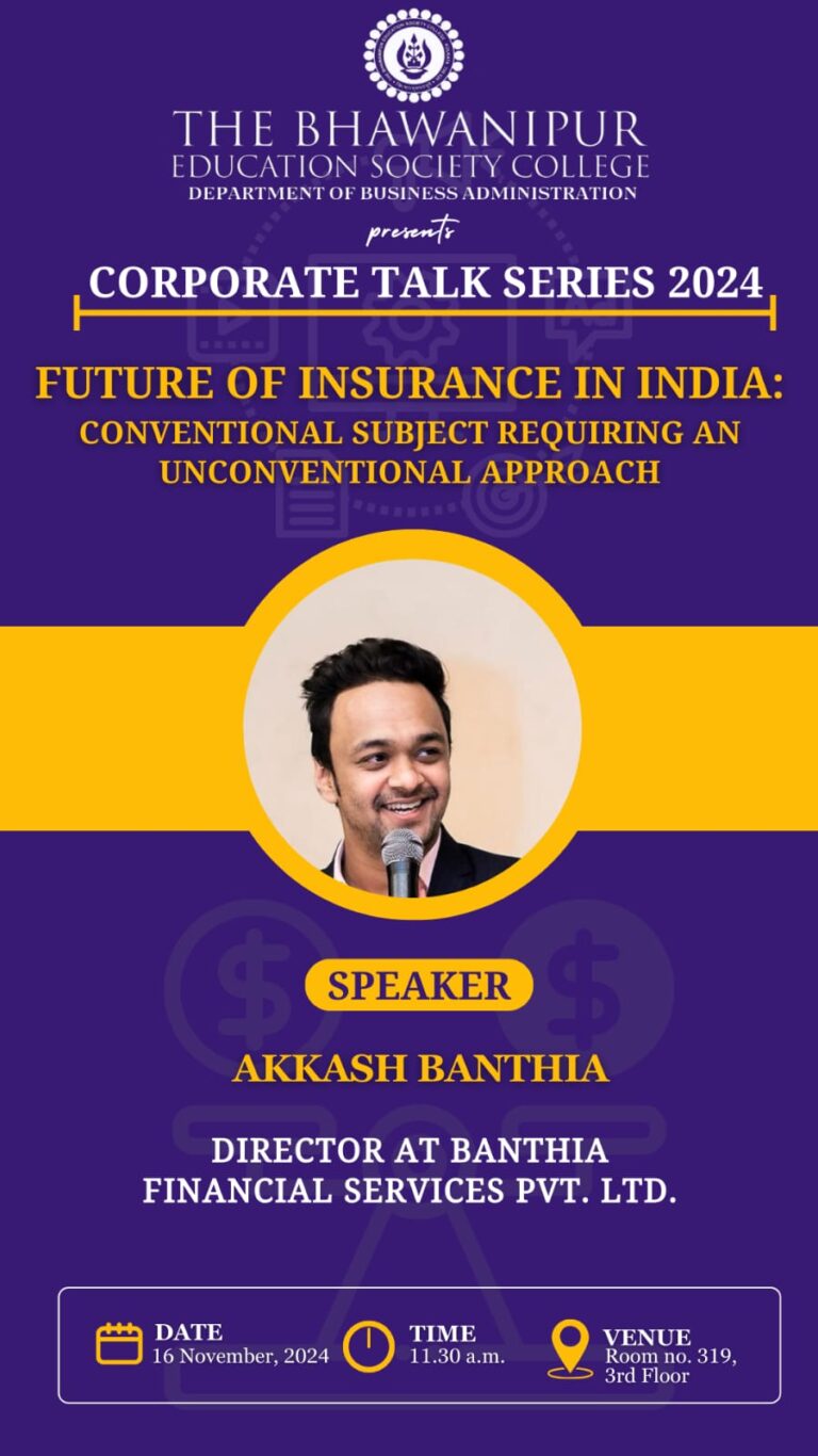 The Corporate Talk Series 2024, hosted by the Department of Business Administration, was conducted on November 16, 2024, in Room No. 319. The seminar, attended by Semester 5 students, delved into the topic, “The Future of Insurance in India: A Conventional Subject Requiring an Unconventional Approach.” The esteemed speaker, Mr. Akkash Banthia, is the Director of Banthia Financial Services Pvt. Ltd. and a distinguished alumnus of the college, graduating in 2014. With over 12 years of expertise in the financial domain, Mr. Banthia embarked on his entrepreneurial journey in 2017 after a stint as an equity research analyst at Motilal Oswal. His professional ethos centers on advancing financial and insurance literacy, particularly among rural communities, and his proficiency lies in the realm of unconventional insurance methodologies.