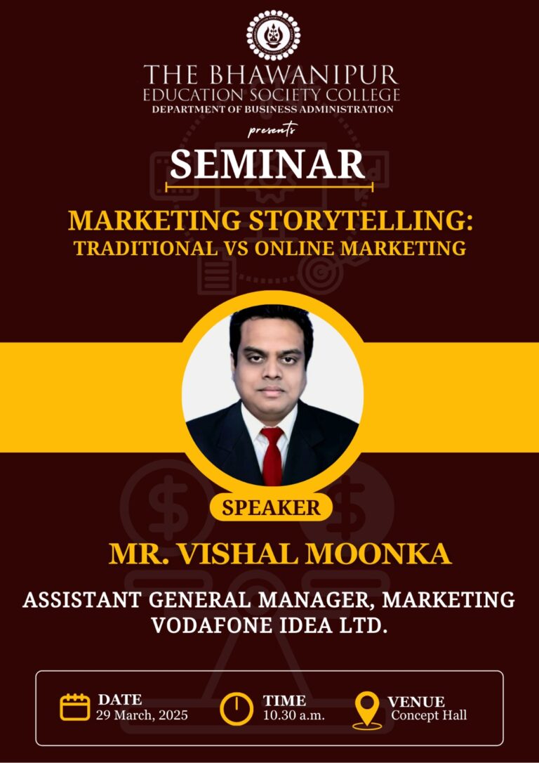 A seminar was conducted by the Department of Business Administration, on 29th March, 2025, at Concept Hall. The Seminar was attended mostly by the Semester-II and Semester-IV students, which delved into the topic “Marketing Storytelling: Traditional vs Online Marketing”.