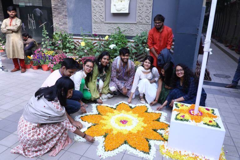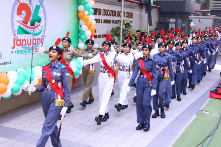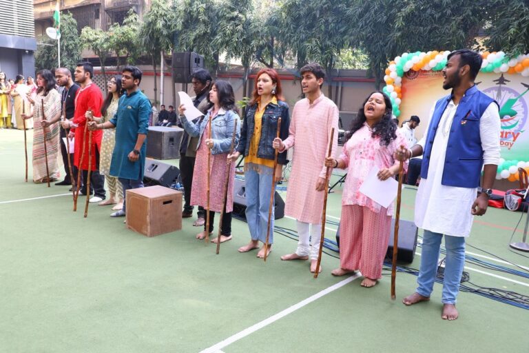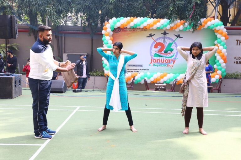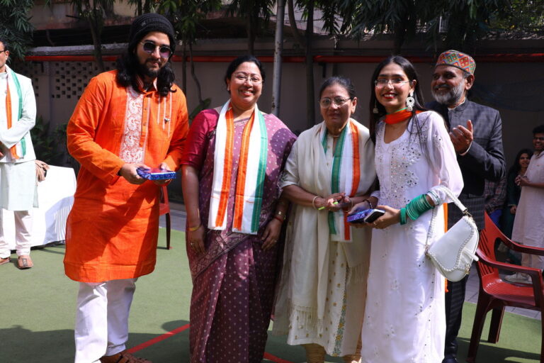 As we entered the new year, the first National level celebration, Republic Day, was marked by the youthful students of The Bhawanipur Education Society College, School, and The Bhawanipur Design Academy who assembled to honor the Indian constitution with a line-up of performances. Members of the Management, teachers & students all gathered at the college Turf at 9:00 A.M all dressed in vibrant ethnic wear. The event started at 9.30 am with the Management felicitated with tricolor Uttariyo. The host extended a warm welcome, inviting guests to witness the majestic flag hoisting ceremony and the release of tricolor balloons into the sky. This was followed by the rendition of the Indian National Anthem. As the flag unfurled, students from ISC School of Bhawanipur, along with the tri-service wings of NCC, orchestrated a dignified March past, paying homage to the national flag.