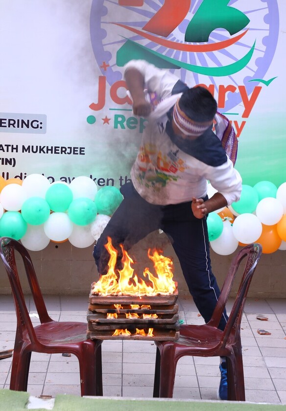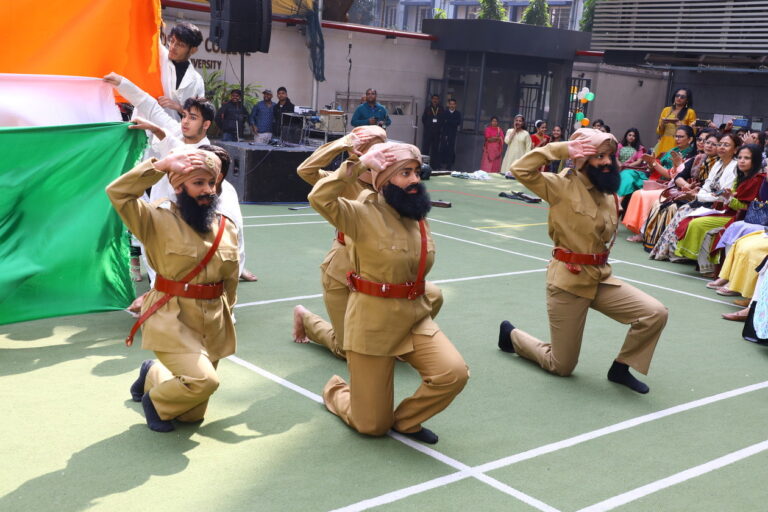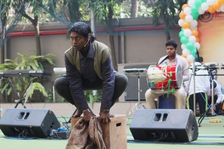 Following it, was an address by the President of the college, Shri Rajnikant Dani, who enveloped the audience with his thoughts on the 75th Republic Day. Soon Prof. Dilip Shah, Rector & Dean of Student Affairs urged the audience to join him in the choral reading of the Preamble to the Constitution of India. Before beginning the performances, the Director General, Dr. Suman K. Mukherjee gave the audience a patriotic note from his speech on Republic Day. Right after his address, the first performance, an act on the life of Bagha Jatin was enacted by a fellow thespian from the Enact collective of the college. The act contained moments from the freedom fighter’s life and the story of how he received the title of ‘Bagha’ Jatin. The act ended with the Enact team coming together to sing the famous song “ Arambh hai Prachand hai” in chorus with the audience, giving each Indian a stronger sense of nationalism.