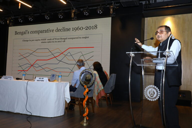 Dr Shiladitya Chatterjee, IAS (Retd.) and Advisor to the Government of Assam, being the fifth panellist discussed his research on the economic revival of Bengal: possibilities and prospects. He threw light on the topic with his detailed presentation, which started with how Bengal has a comparative decline in average state GDP growth rate and the high poverty rate, which has been improved. Starting from the Partition of Bengal, comparatively poor human development, a public debt overhang to agricultural growth plateaued and poor industrial relations, he discussed the factors that have room for improvement.