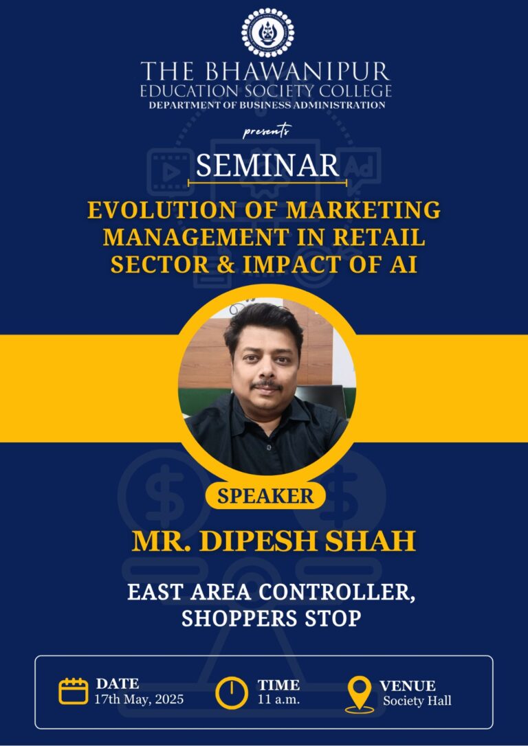 The Department of Business Administration at The Bhawanipur Education Society College successfully organized a seminar titled “Evolution of Marketing Management and Impact of AI” on 17th May at 11AM. The event was held at the Society Hall and attracted an enthusiastic audience, with over 50 students in attendance from all semesters.