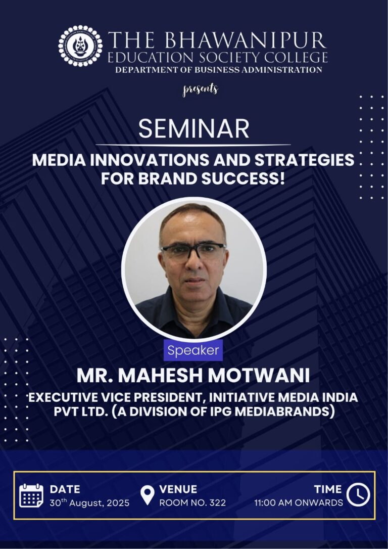 The Department of Business Administration at The Bhawanipur Education Society College successfully organized a seminar titled ” Media Innovations and Strategies for Brand Success!” on 30th August at 11AM. The event was held in Room 322 (3rd Floor) and attracted an enthusiastic audience, with over 50 students in attendance from all semesters.