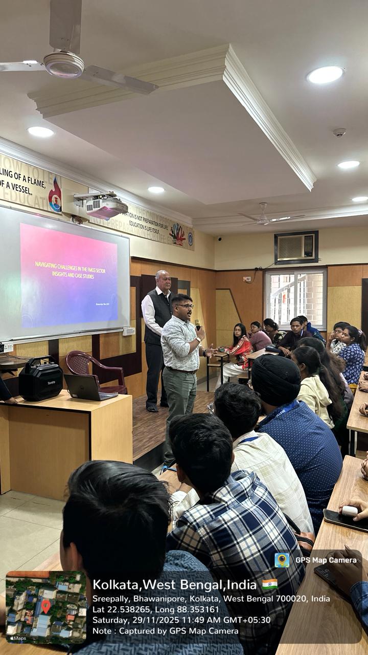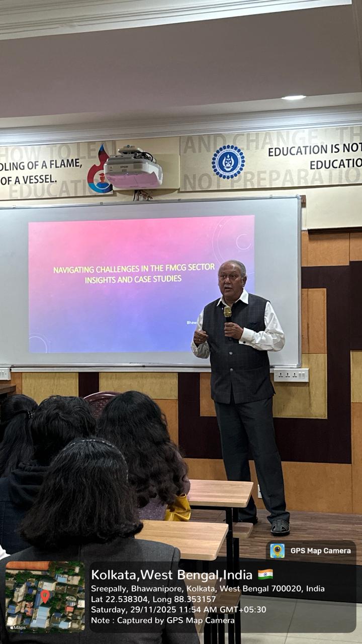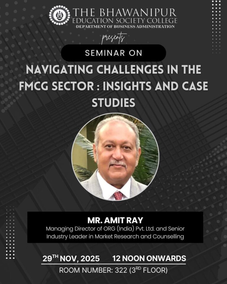 The Department of Business Administration at The Bhawanipur Education Society College successfully organized a seminar titled ” Navigating Challenges in the FMCG Sector: Insights and Case Studies” on 29th November at 12 Noon . The event was held in Room 322 (3rd Floor) and attracted an enthusiastic audience, with over 100 students in attendance from all semesters.