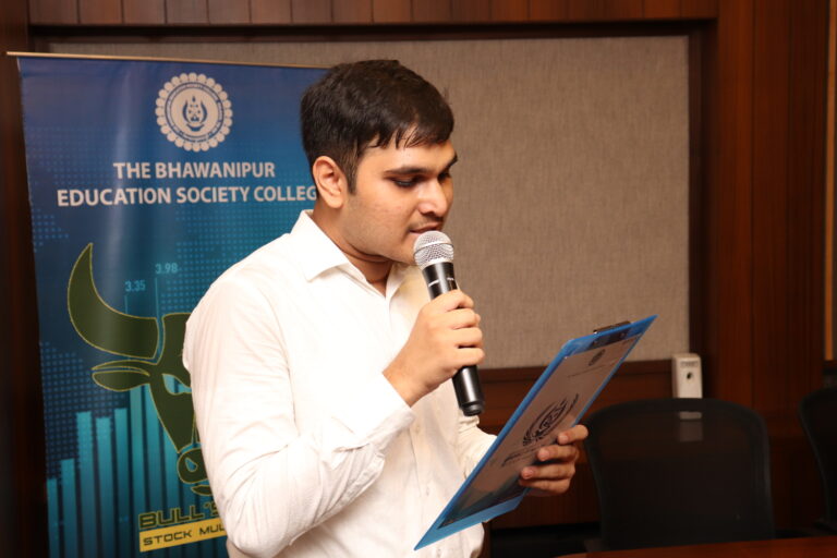 The Bhawanipur Education Society College recently organised a captivating event on 19th July 2023 from 12:00noon at The Society Hall on the topic “Shares Pe Charcha.” This session was part of the initiative of the Bull’s Eye collective of the college. The event aimed to enlighten students about the fascinating world of stock markets and investment, with the guest speaker, Mr. Abhishek Dubey, who provided valuable insights and experiences. The session spanned over two hours, and participants were actively engaged throughout the event.