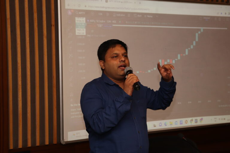 The session commenced with Mr. Abhishek Dubey, an expert in the field, captivating the audience with his extensive knowledge of the stock market and highlighting its enduring relevance in today’s financial landscape. He masterfully explained the concept of Risk Management by drawing a parallel to a small-budget movie, making it easy for the students to grasp the importance of managing risks in investment decisions.