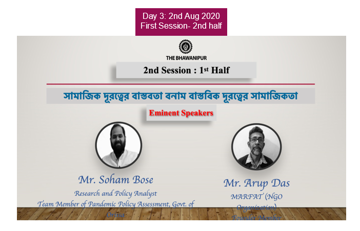 Mili Samaddar comprehensively explained this sudden emergence of a worldwide pandemic situation that has posted a huge challenge to the future of humanity as well as to its supposedly mighty knowledge base of science and technology. She said that we are facing a tradeoff between economic down turn and physical wellbeing i. e, moving out of the frying pan with the five.
