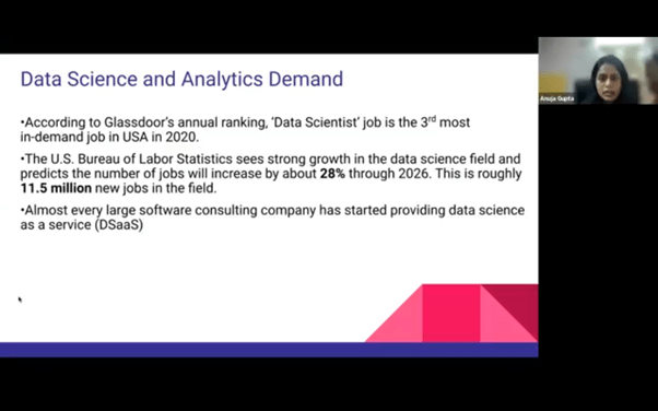 The session saw a mixed audience from different semesters and courses. The floor was taken by Dr. Menorca Chaturvedi who currently works in Boehringer Ingelheim, a German company which is one of the top pharmaceutical companies of the world and Ms Anuja Gupta who is working as a Data Scientist at FedEx, Custom Critical, USA.