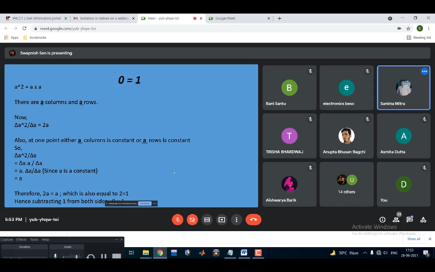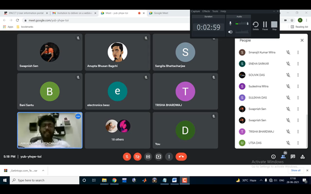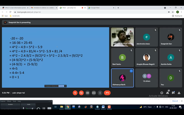 The Department of Electronics organised a webinar on 28th of June, 2021 over Google Meet. The topic of deliverance was – Basic mathematical conceptions and misconceptions. The talk was delivered by Mr. Arkaprava Bhattacharjee, a London Mathematics Society member pursuing double majors in mathematics and applied statistics from The University of Alberta, Canada. The discussion was interesting and worthwhile throughout as the attendants pursuing their graduation found it helpful and cleared their misconceptions.