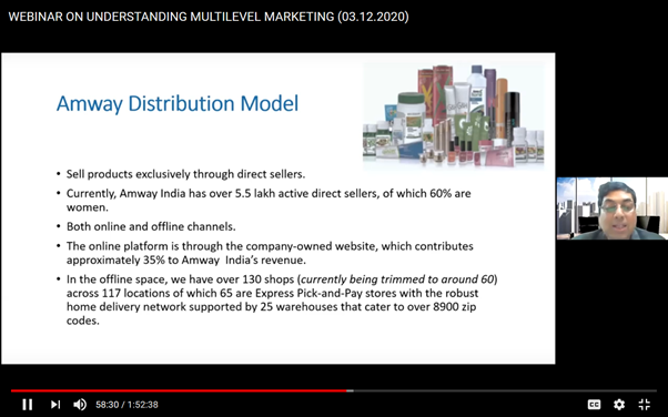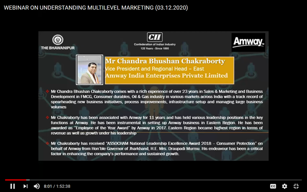 Well, to learn and understand Multi-Level Marketing from the largest MLM company in the world, Amway. The Bhawanipur Education Society College organized an Online webinar in collaboration with Amway and Confederation of Indian Industry on 3 December 2020. The webinar was started by Ms. Anuradha Chakraborty, the deputy director of CII. The coordinator of B.Com Prof. Minakshi Chaturvedi gave the welcome address and invited Mr. Chandra Bhushan Chakraborty, the vice president and regional head east Amway India Enterprise Private Limited. He spoke about the marketing strategy of the direct entities which are operated under multi-level marketing. This was the opportunity to learn it from the market leader in this space. Amway is a multi-level marketing. The company is selling its products by direct sales.