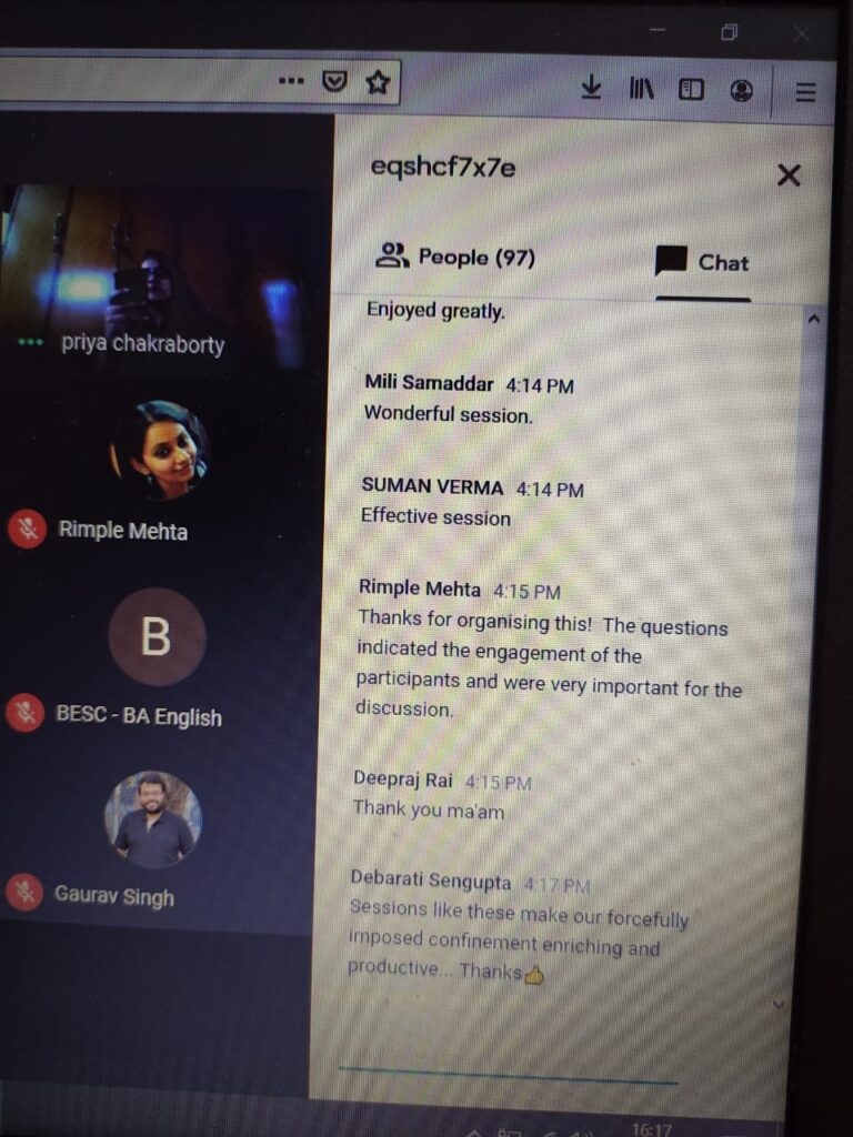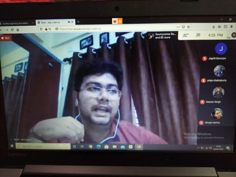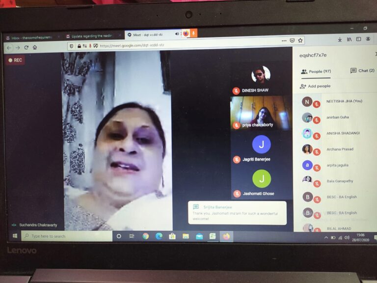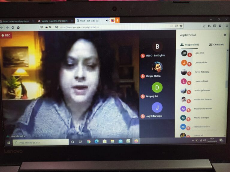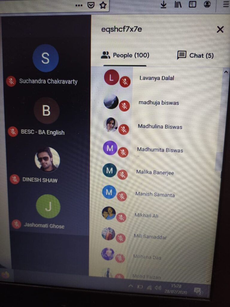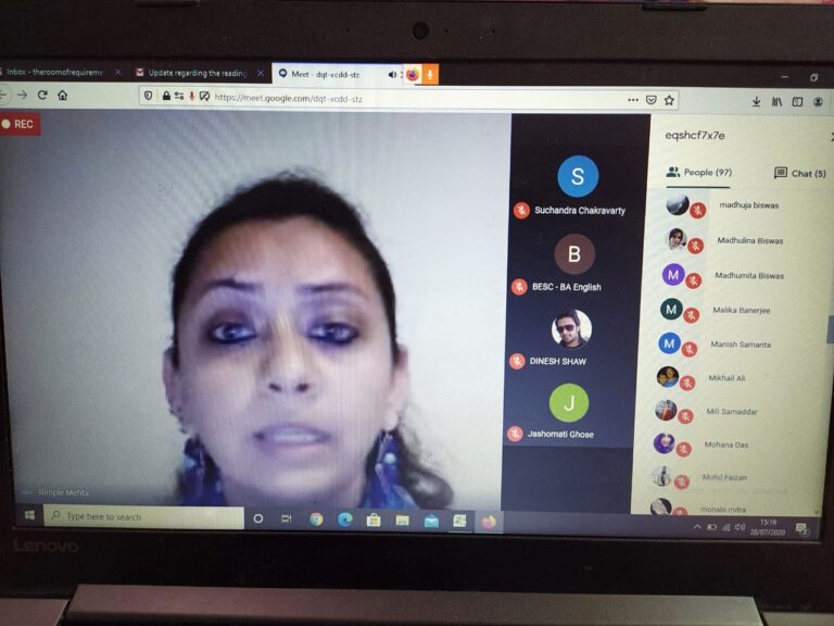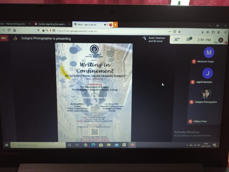 On 28th July 2020, an international online reading session titled ‘Writing in Confinement’ (in collaboration with IQAC) was organized by the English department of The Bhawanipur Education Society College. The event was open to all the faculty members and students of the college, along with research scholars, activists, creative writers and academicians from all over the world. The session was organized on Google Meet. An optimum attendance of 101 participants was recorded during the hosting of the event.