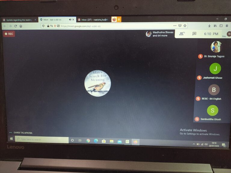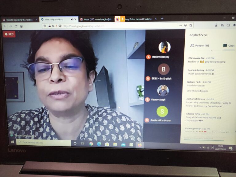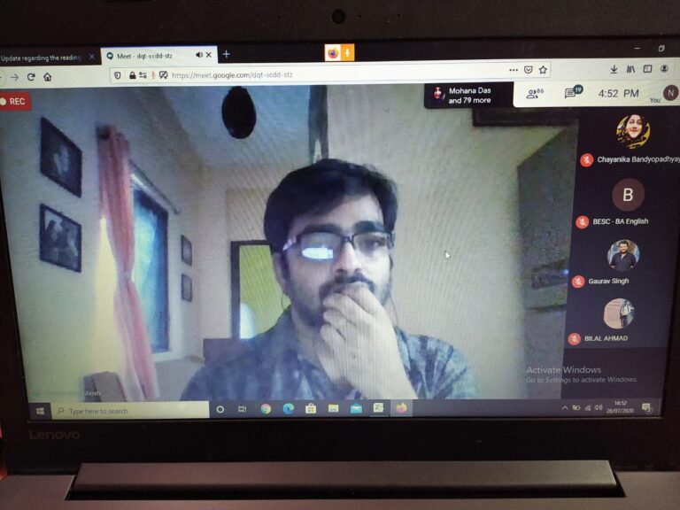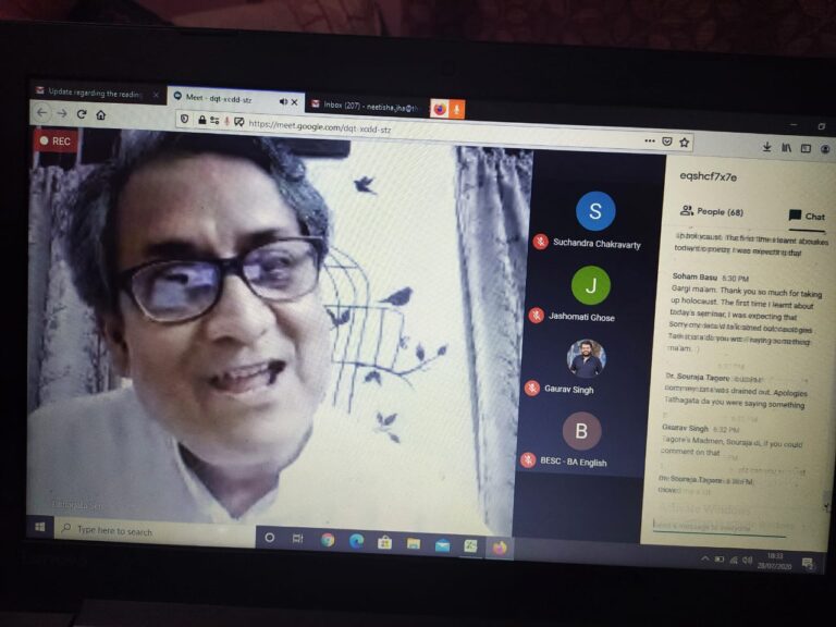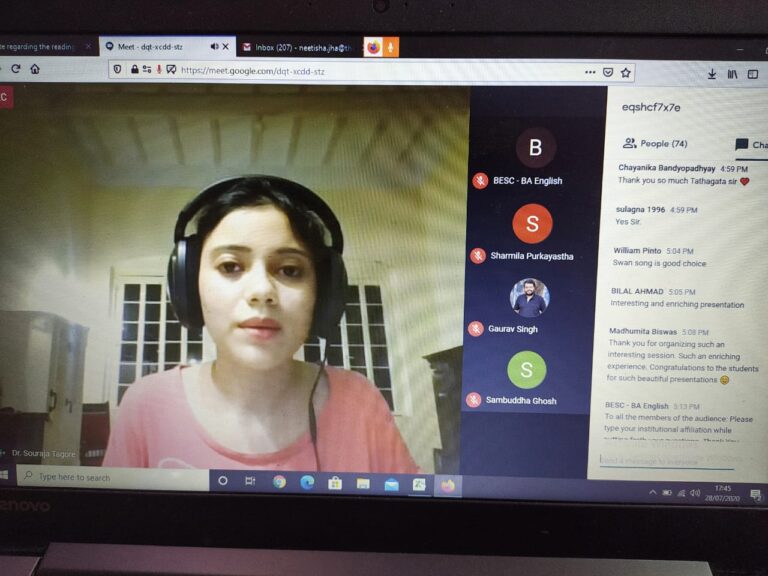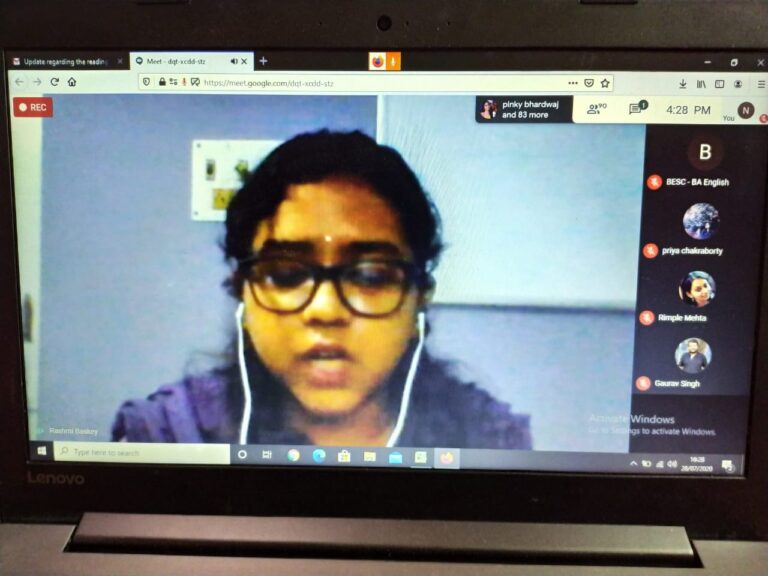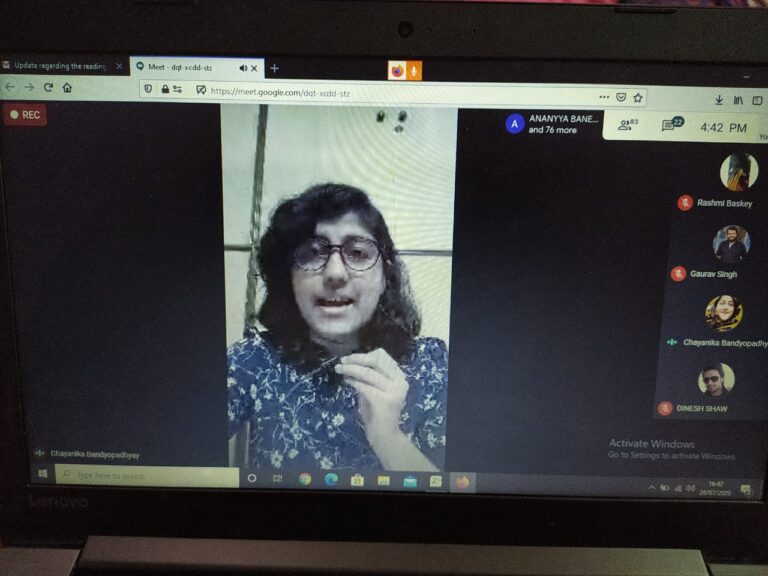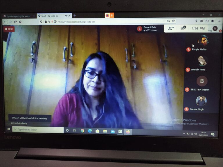 On 28th July 2020, an international online reading session titled ‘Writing in Confinement’ (in collaboration with IQAC) was organized by the English department of The Bhawanipur Education Society College. The event was open to all the faculty members and students of the college, along with research scholars, activists, creative writers and academicians from all over the world. The session was organized on Google Meet. An optimum attendance of 101 participants was recorded during the hosting of the event.