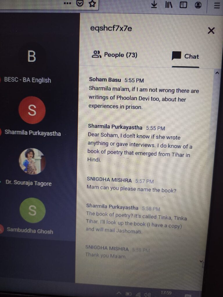 The reading session commenced at 3pm with the inaugural address of Dr. Suchandra Chakravarty, Teacher-in-Charge of The Bhawanipur College. The first session of the day consisted of two keynote addresses. The first keynote address was delivered by Dr. Rimple Mehta, Lecturer, School of Social Sciences, Western Sydney University, who joined the online event from Sydney. In her talk titled Confinement and Resistance, Dr. Mehta read out excerpts from letters written by Bangladeshi women in Correctional Homes in Kolkata, India. In a touching and insightful presentation, she spoke of the various kinds of love that blossom in the hearts of women in confinement, and the challenges they face while addressing these emotions.
