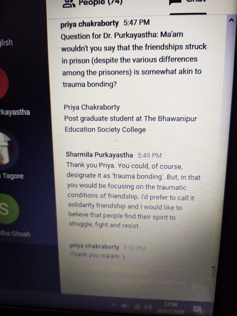 The second speaker was Dr. Sharmila Purkayastha, Associate Professor, Department of English, Miranda House, University of Delhi. Joining from Delhi, Dr. Purkayastha delivered a talk titled Barred Writings: A British School Teacher’s Experience as a Naxalite Prisoner. The audience learnt of the uncertain lives of Naxal prisoners, and how confinement is a more perpetual state of being for them compared to others. However, she too established through her talk how feelings of love and humanity were not lacking in the constitution of these people as well.